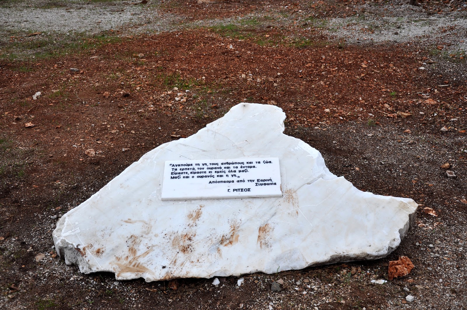 Ο βαθιά ανθρώπινος και οικολογικός στίχος του Ρίτσου “καρφωμένος” στη μαρμάρινη πέτρα ας μας εμπνέει και ας μας είναι οδηγός στη ζωή μας.