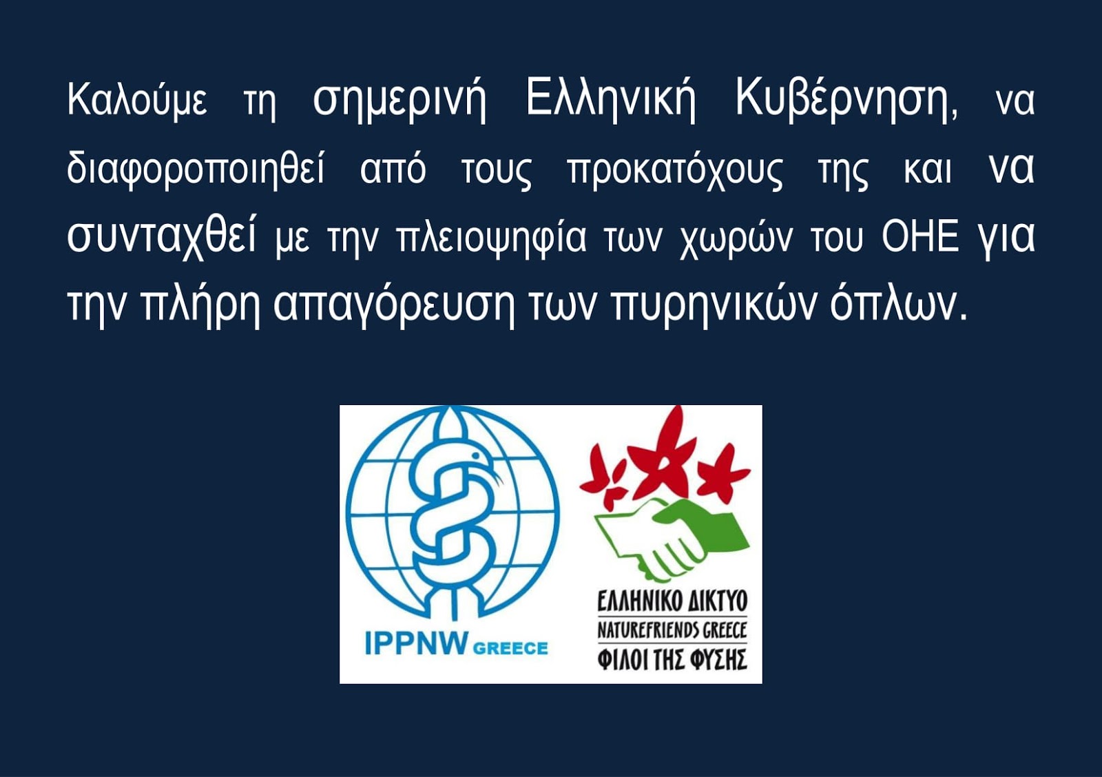 We urge the Greek government to change the existing policy that against the strong will of the Greek citizens, the declared position of all political parties and the strangle of Peace movement and take concrete actions for a Nuclear free world.